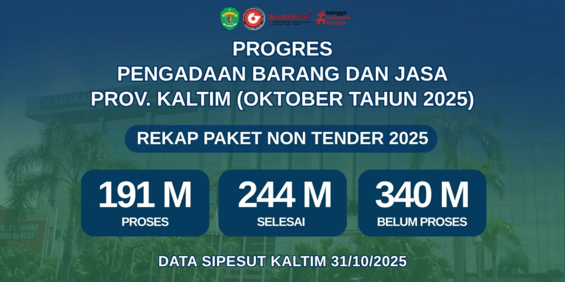 Total nilai pengadaan non-tender yang telah selesai mencapai Rp 244,78 miliar, menunjukkan peningkatan efektivitas pencatatan hasil pemilihan penyedia pada Sistem Pengadaan Secara Elektronik (SPSE) dan E-Katalog di lingkungan Pemerintah Provinsi Kalimantan Timur.